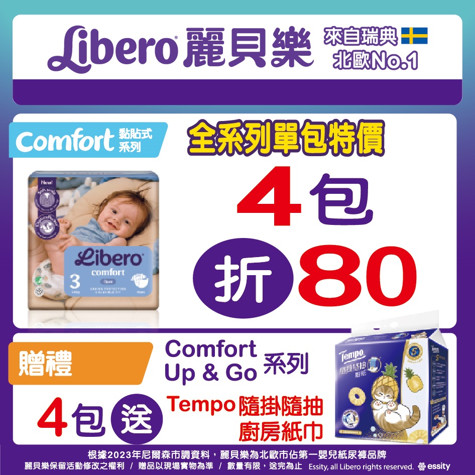 麗貝樂黏貼式全面特價,4包折80元再送Tempo隨掛隨抽廚紙160抽,送完為止