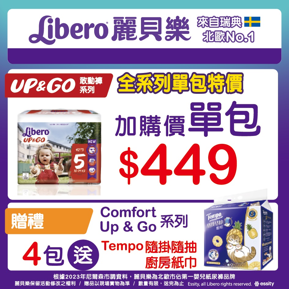 麗貝樂敢動褲全面特價,4包再送Tempo隨掛隨抽廚紙160抽,送完為止