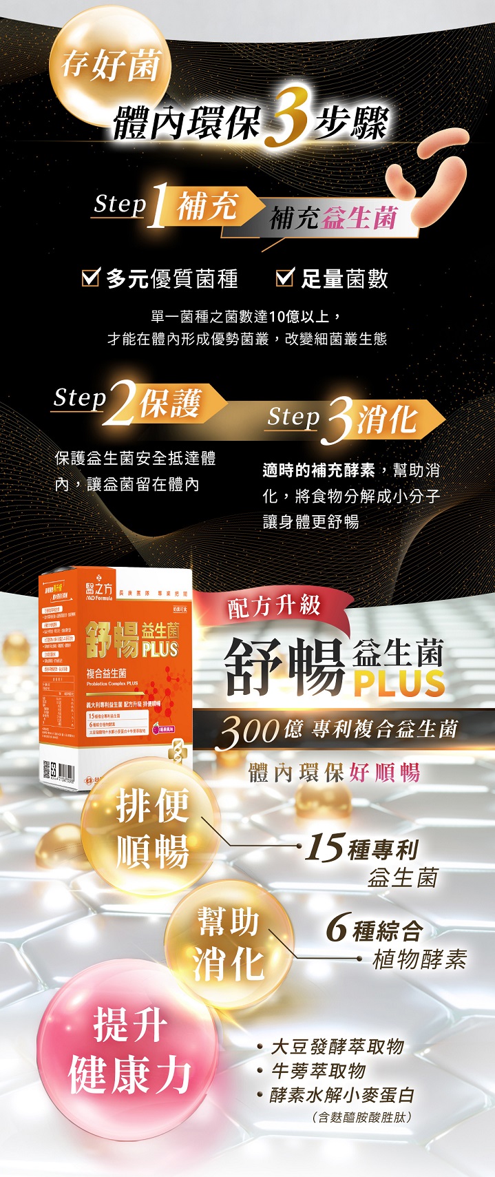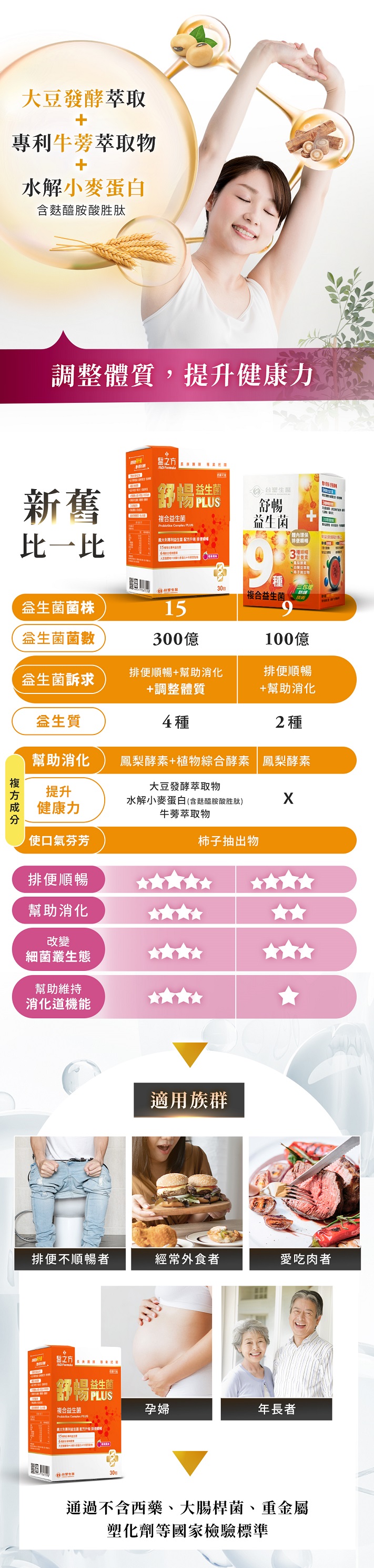 主要成分:15種複合專利益生菌、6種綜合植物酵素 、大豆發酵物、水解小麥蛋白、牛蒡萃取物