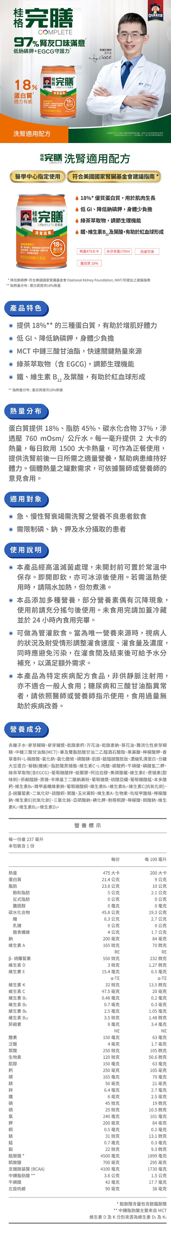.提供 18%**的三種優質蛋白質與BCAA,補充洗腎病患所需的營養,蛋白質有助於組織的修復