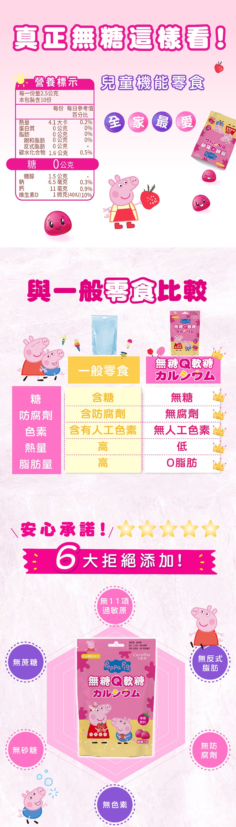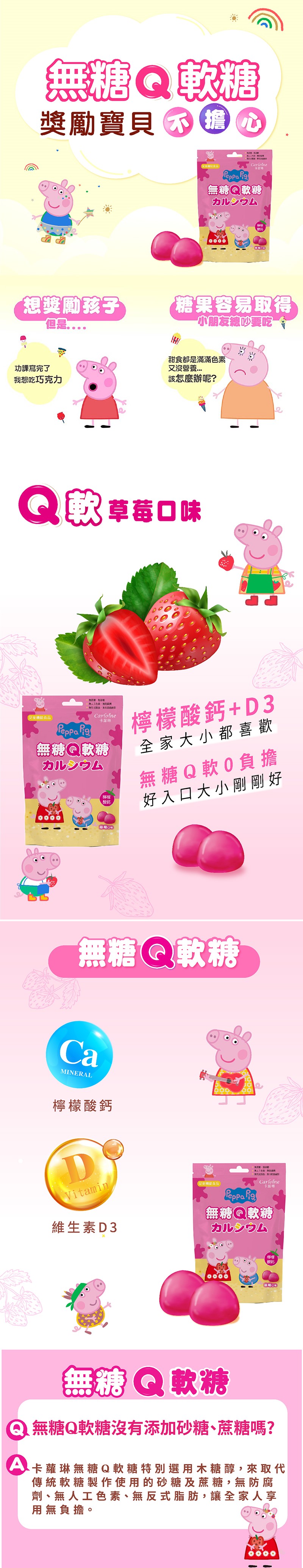商品注意事項: 1.製造日期與有效期限,商品成分與適用注意事項皆標示於包裝或產品中。 2.產品網頁會因拍攝關係,圖檔/顏色略有差異,實際請以廠商出貨商品實物為主。 3.產品圖及文案若有變動,敬請參照實際商品為準。 卡蘿琳 無糖Q軟糖 草莓口味|兒童鈣 【內容】25克/包;10入/包 【食用建議】2歲以上具有咀嚼能力之幼童。 【保存方法】請存放於30度C以下陰涼乾燥處,避免日光直曬及遠離高溫環境。 【注意事項】 1.為避免噎食,三歲以下幼童請於成人監護下食用,請咀嚼,勿整顆吞食。 2.本產品外層添加植物油保護有效成分,軟糖表面會有少許白色現象皆屬正常,請安心食用。 3.吞嚥咀嚼困難者,請小心食用。 4.開封後請盡快食用完畢。