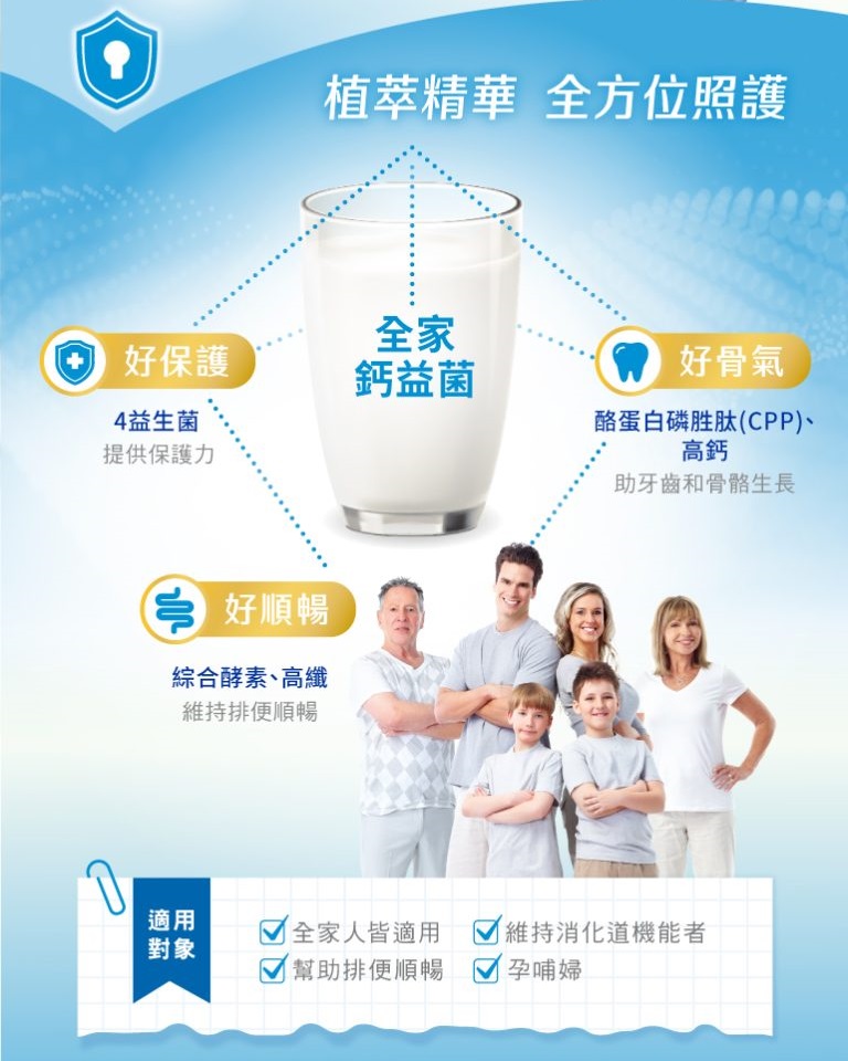 成分:脫脂奶粉、麥芽糊精、全脂奶粉、葡萄糖、糊精纖維(小麥來源)、蔗糖、綜合礦物質、綜合維生素、菊糖(菊苣纖維)、關華豆膠、香料、酪蛋白水解物(含酪蛋白磷肽)、綜合乳酸菌(乾酪乳桿菌、鼠李糖乳桿菌、乳雙歧桿菌、植物乳桿菌)、綜合酵素
