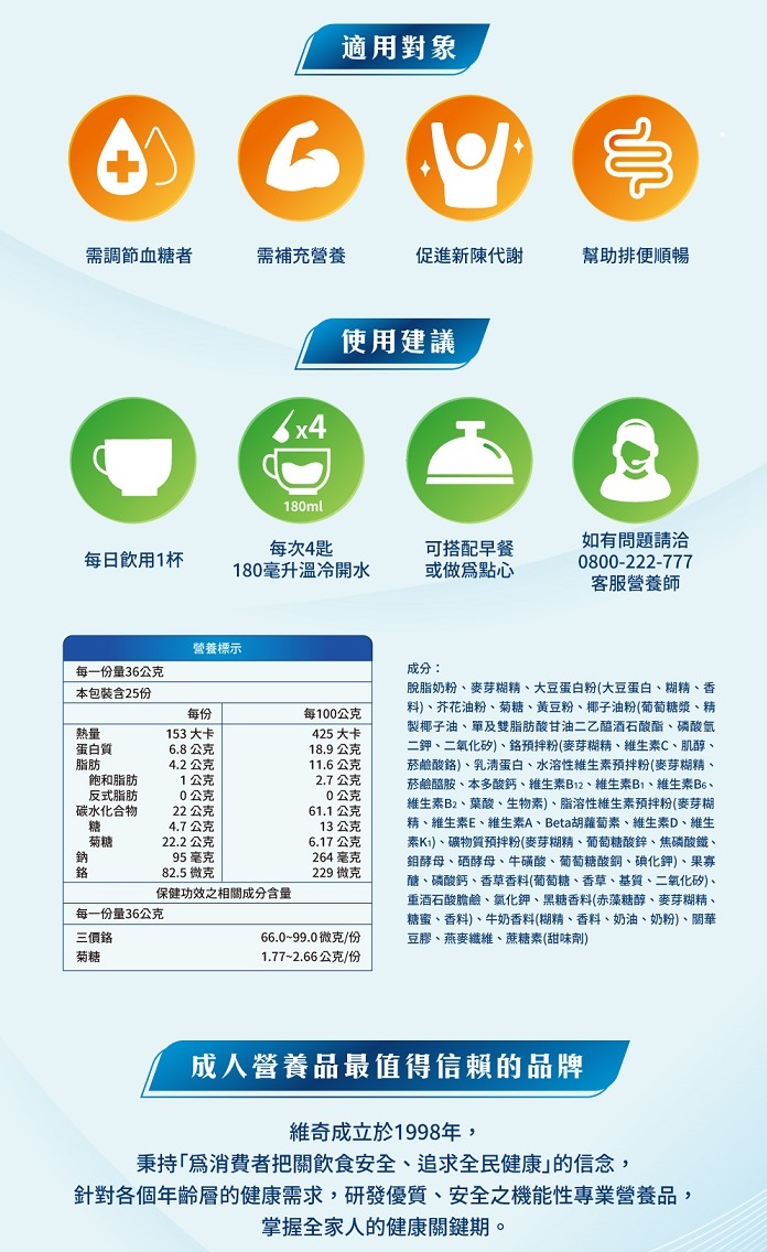 高纖:燕麥纖維,增加飽足感,維持消化道機能
