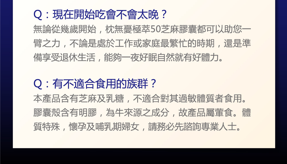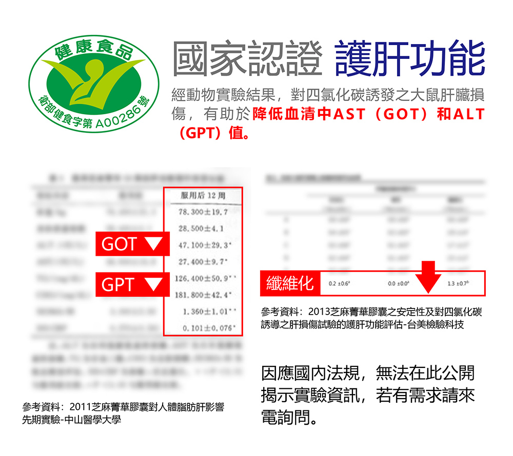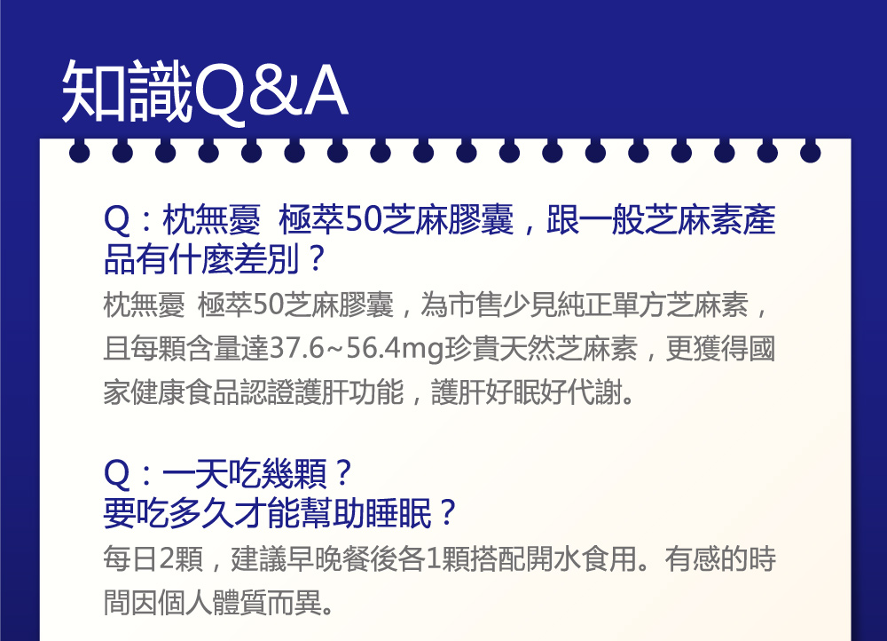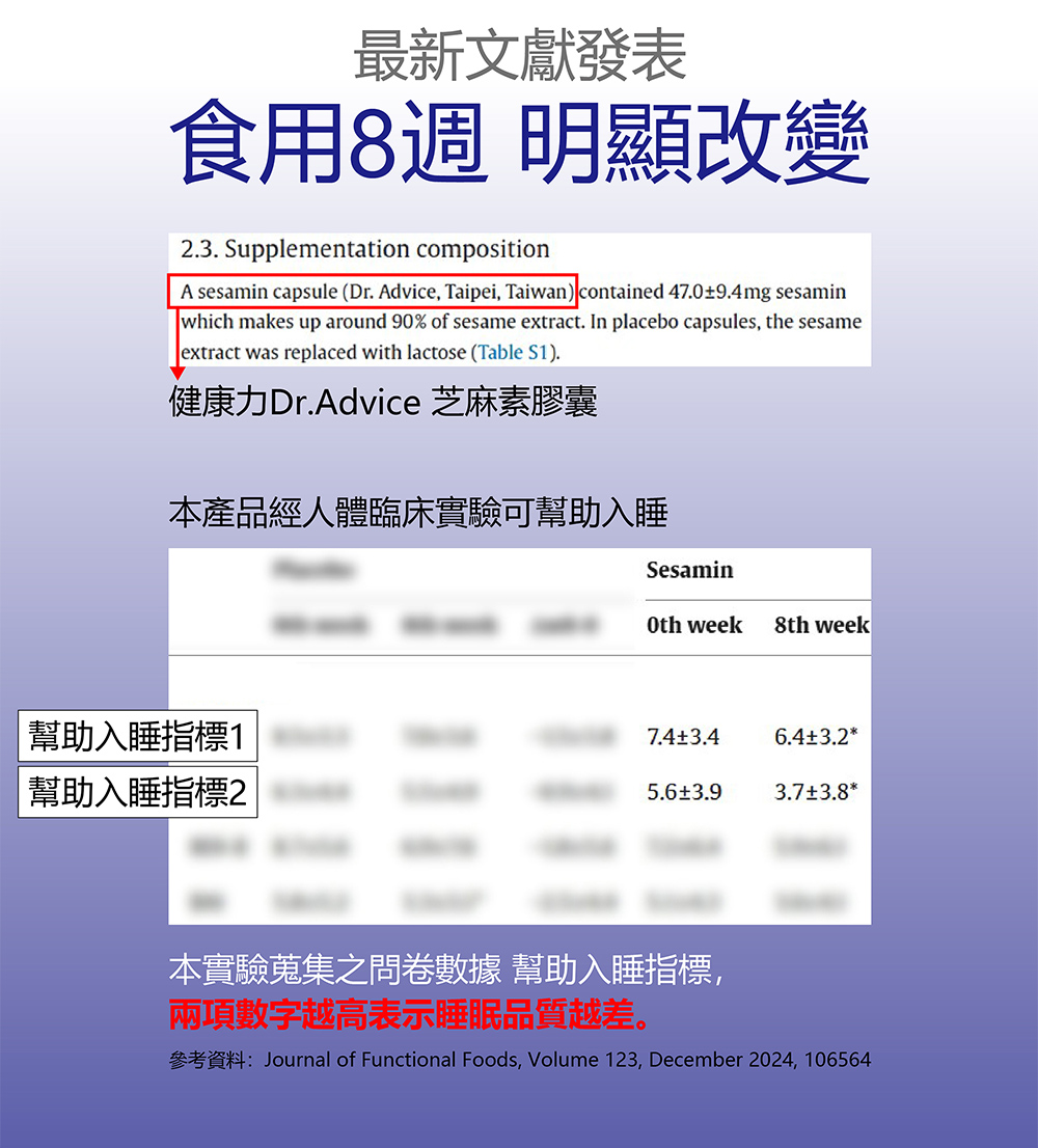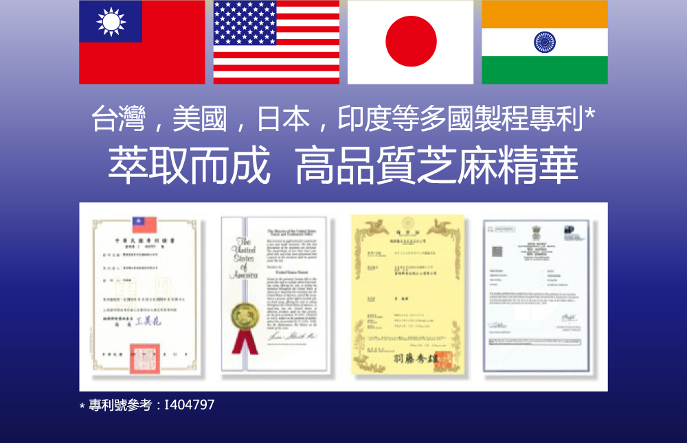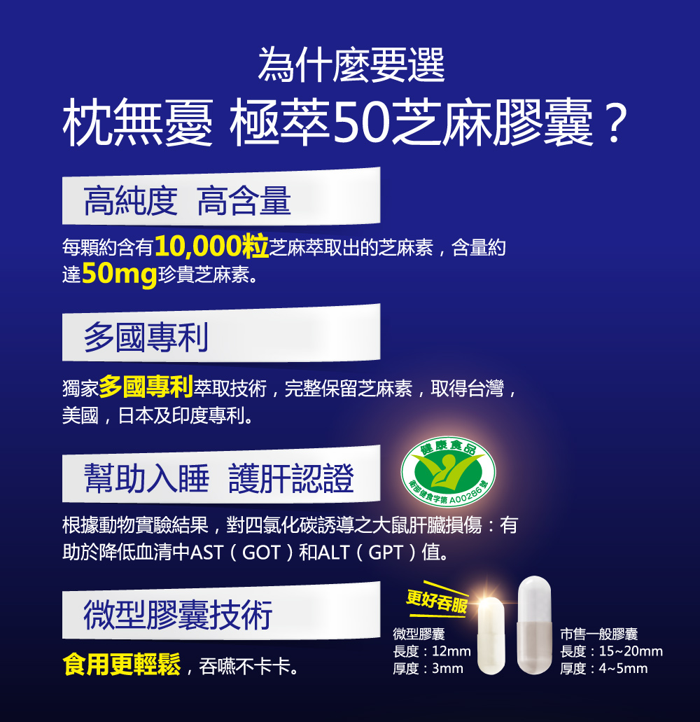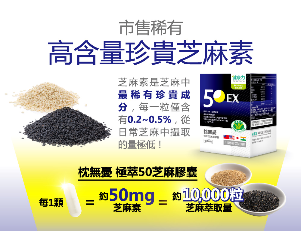 成分:芝麻複合物乳糖、芝麻抽出物(含芝麻素)、二氧化矽、硬脂酸鎂。膠囊成分:明膠、二氧化鈦、硫酸月桂酯鈉、純水